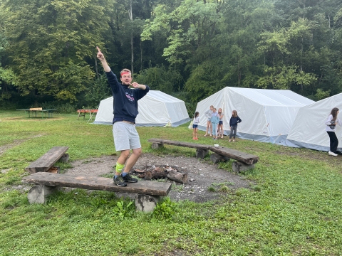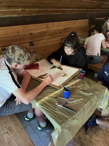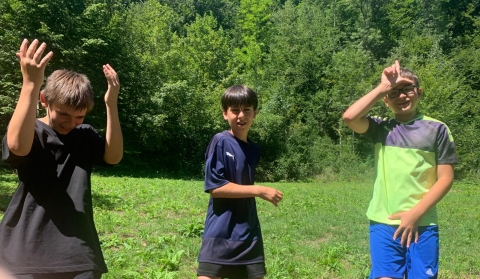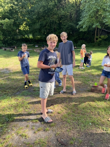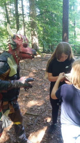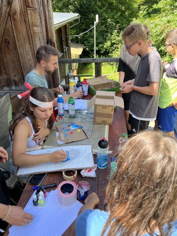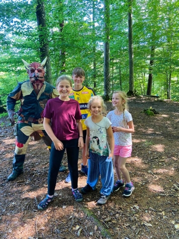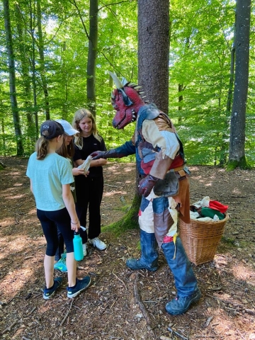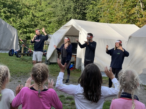 "Es bedroht ein böser Zauber unseren Zeltplatz und ihr müsst ihn schützen. Wir brauchen ein magischen Schutzpatron fürs Zeltlager. Wir haben verbündete Zauberer gefragt, die sich schonmal mit einem solchen Fluch auseinandergesetzt haben, und sie haben uns überliefert, dass die Farbe blau besonders effektiv gegen den Zauber wirkt und große Schutzkräfte mobilisiert. Nun liegt es an euch, unseren Zeltplatz zu schützen."