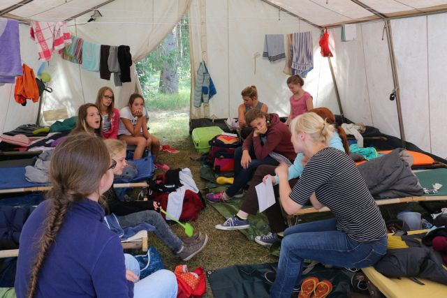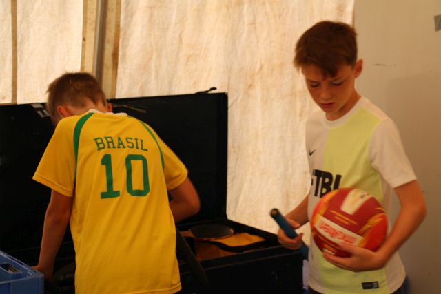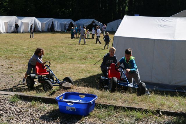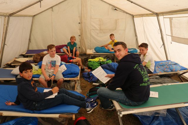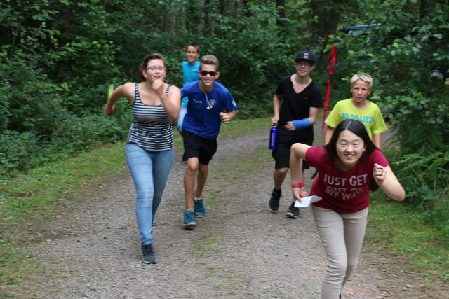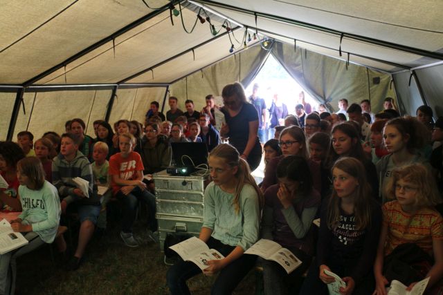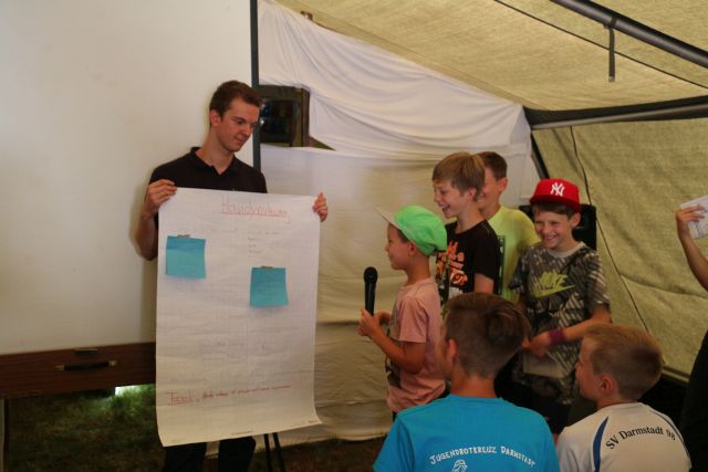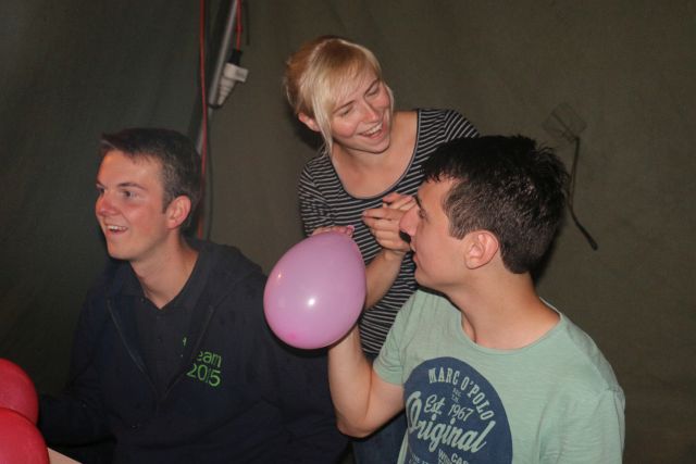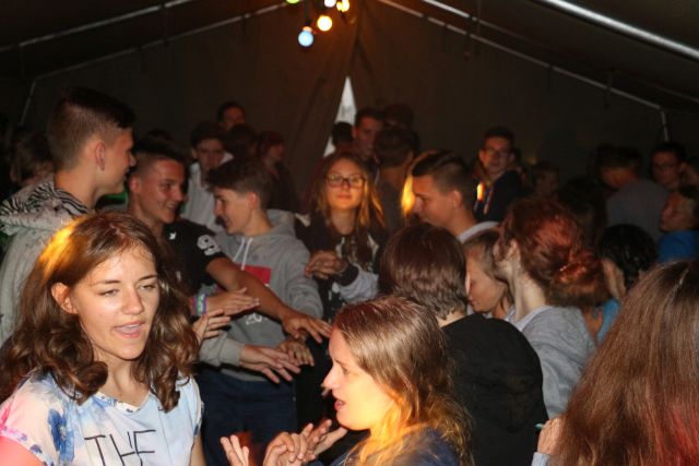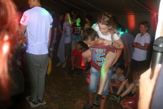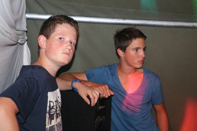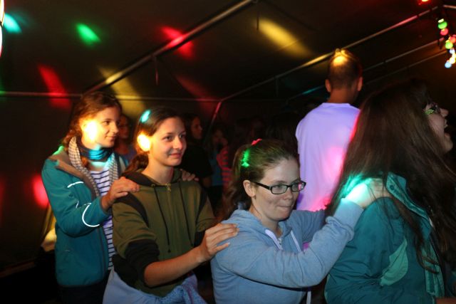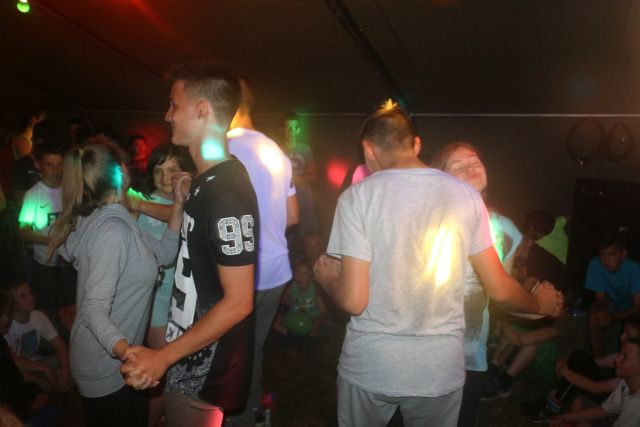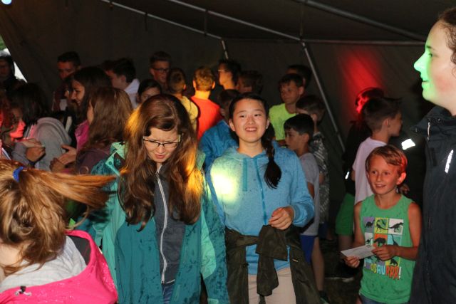 DJ Johannes und DJ Flo sind für die Kennenlerndisko zuständig. Mit kleinen Spielen und viel Musik heizten die Beiden den Teilnehmern und Teamern richtig ein, so dass der Regen vergessen ging.