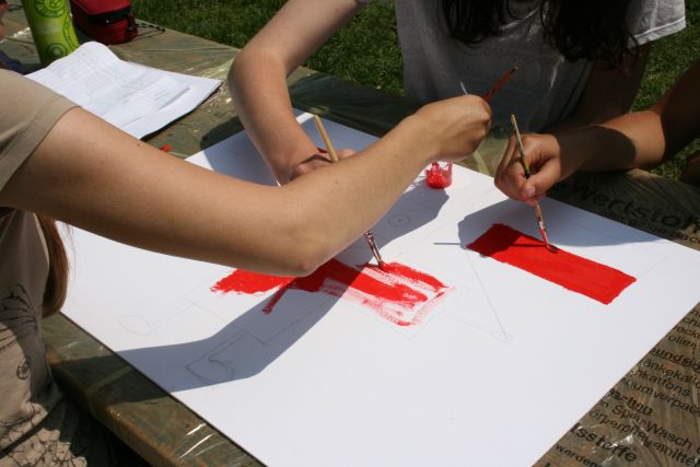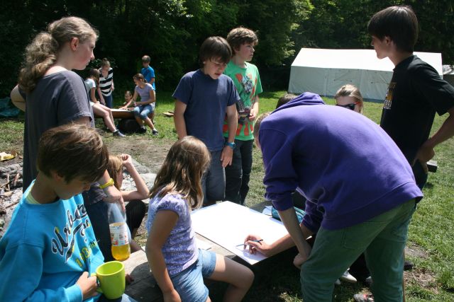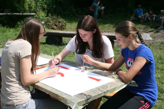 Für das Zeltlagermaskotchen gab es an Stationen im Wald für die unterschiedlichsten Aufgaben Farben aus denen jede Gruppe ein Bild gestaltete.