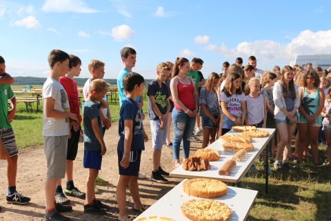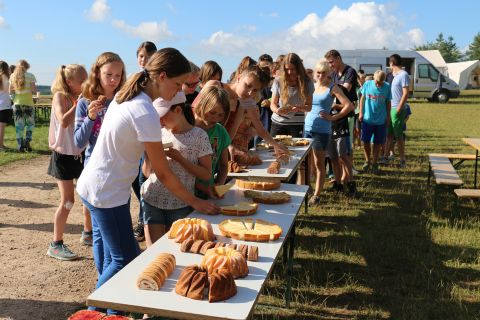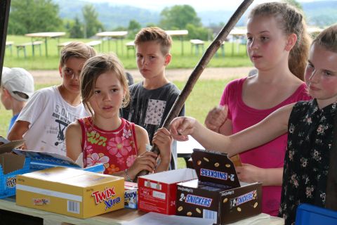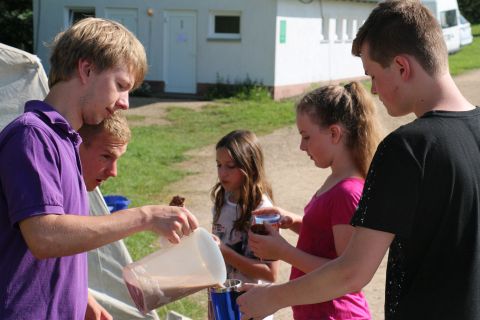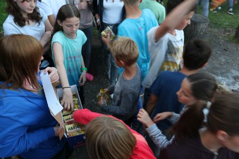 Bei der Hauptstation auf dem Platz könnt ihr die Gummibärchen dann in Goldbärsaft umwandeln indem ihr verschieden farbige Gummibärchen kombiniert, doch Achtung… alle 20 Minuten ändert die Gummibärchen Farbkombination für den Goldbärsaft. Die Gruppe, die am Ende die meisten Liter Goldbärsaft produziert hat, hat gewonnen. Für eine Farbkombination gibt es einen Liter Goldbärsaft. Es sind auch Goldene Bärchen um den Zeltplatz unterwegs, diese könnt ihr direkt in einen Liter Goldbärsaft umwandeln.