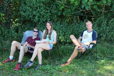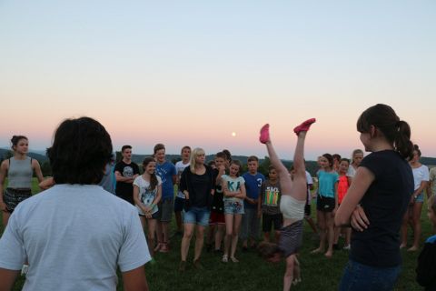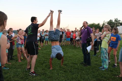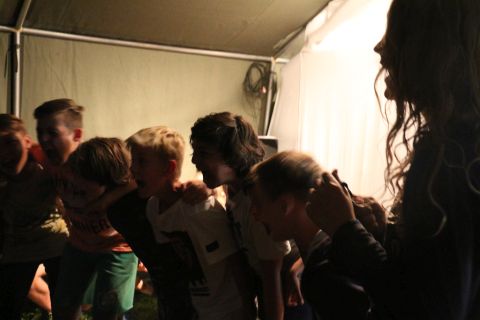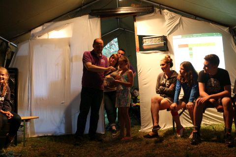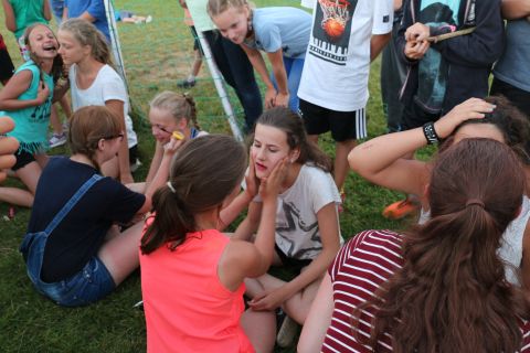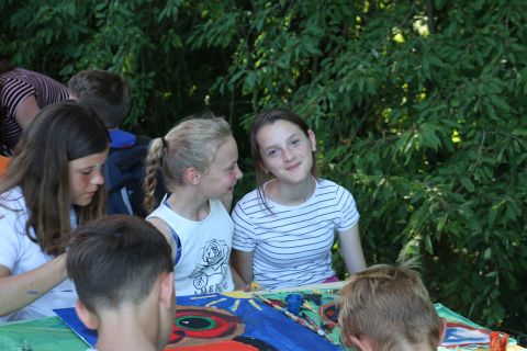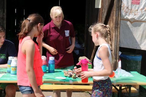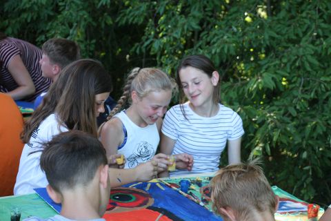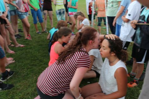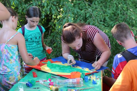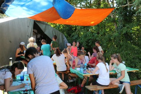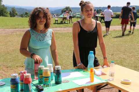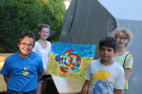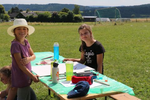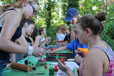 Als dreiviertel Tagesgeländespiel wird das Summercamp in ein Camp der Künste verwandelt. Alle sind im Wald unterwegs um Aufgaben an Stationen zu lösen. Hier bekommen sie Farben um daraus das Zeltlagermaskottchen zu kreieren.