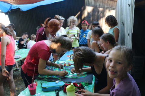 Als dreiviertel Tagesgeländespiel wird das Summercamp in ein Camp der Künste verwandelt. Alle sind im Wald unterwegs um Aufgaben an Stationen zu lösen. Hier bekommen sie Farben um daraus das Zeltlagermaskottchen zu kreieren.